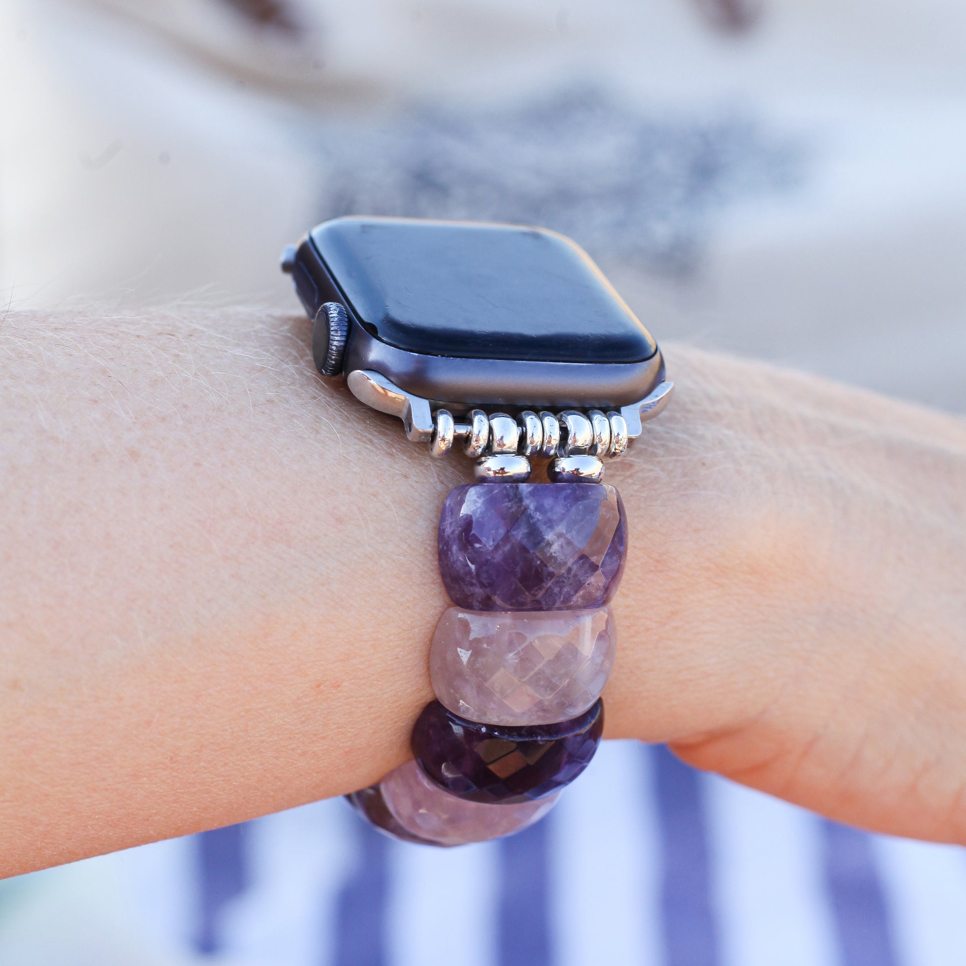 💎 Crystal Energy & Materials: • **Natural Amethyst Stones** (12 mm faceted squares) – known for clarity, inner peace & intuitive alignment • **Elastic stretch design** – easy to slide on, fits snugly & comfortably • **Silver-tone stainless steel connectors** – fits Apple Watch 38/40/41 mm to 42/44/45 mm • Handmade with loving care in small batches