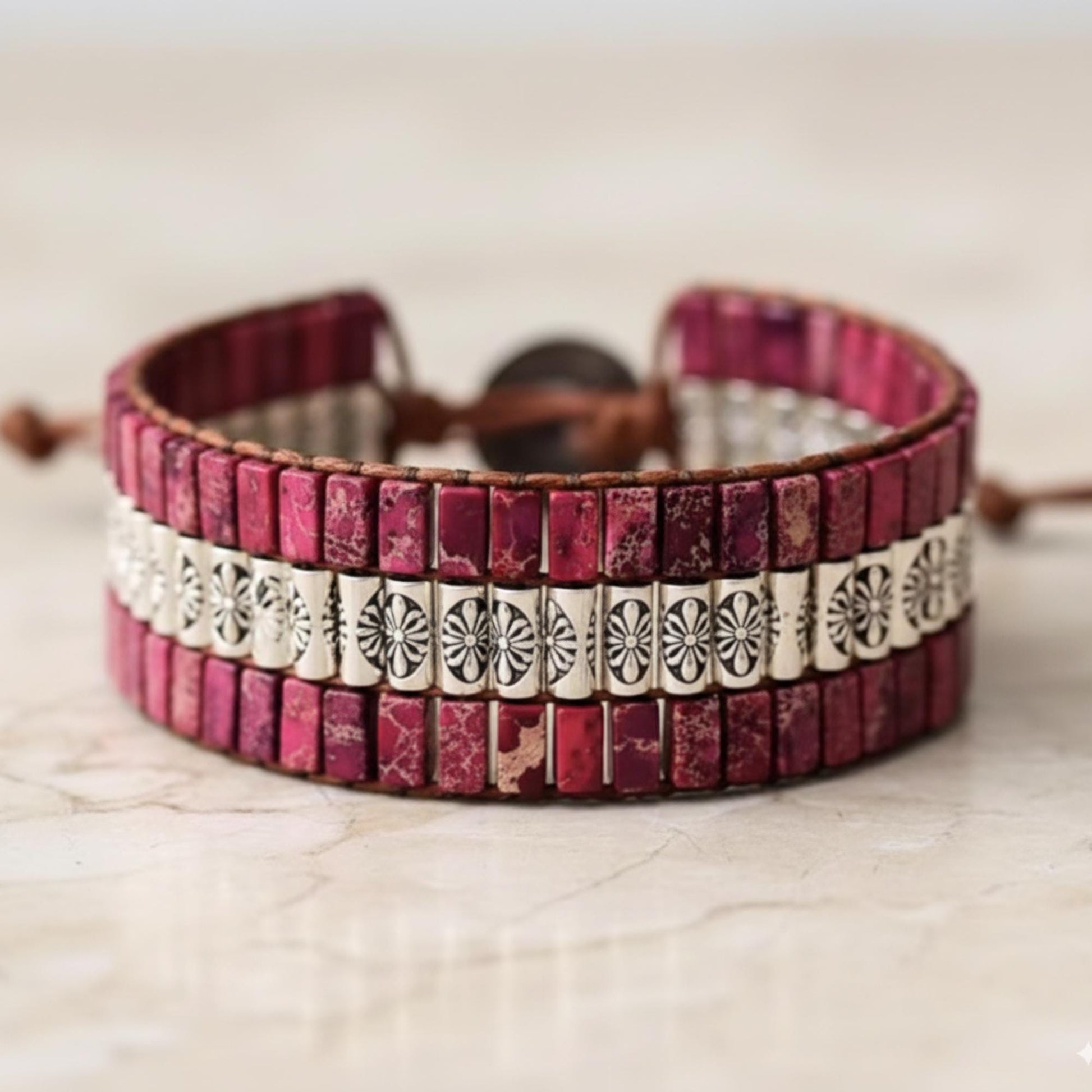 ➳ Wide wrap bracelet designed with natural gemstones and silver floral beads. Each color option carries its own meaning, bringing earthy elegance and a soulful boho touch.