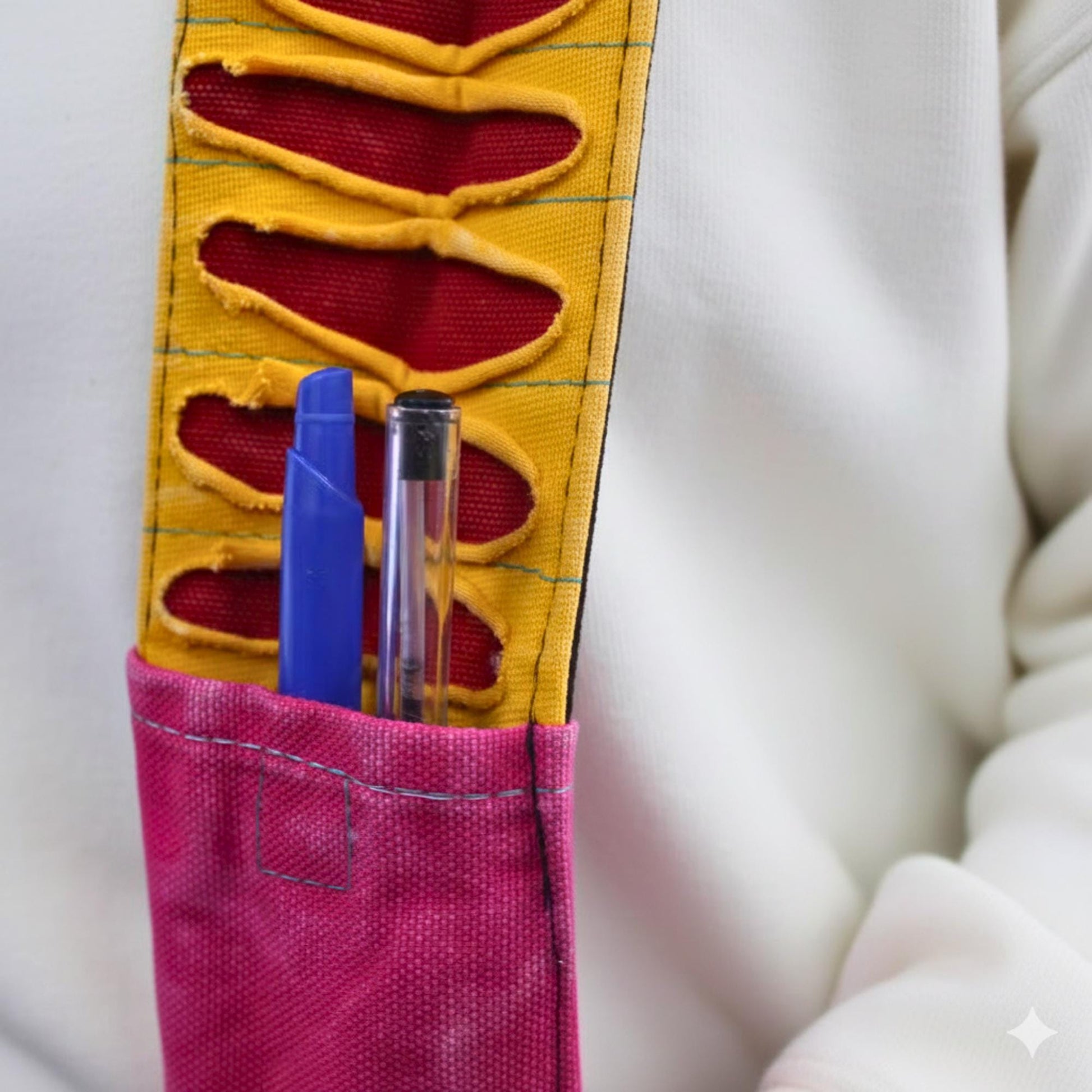 ✦ Crafted from 100% cotton with a comfortable wide strap, a coconut button closure, and an extra small pocket on the strap — perfect for pens, keys, or little essentials.