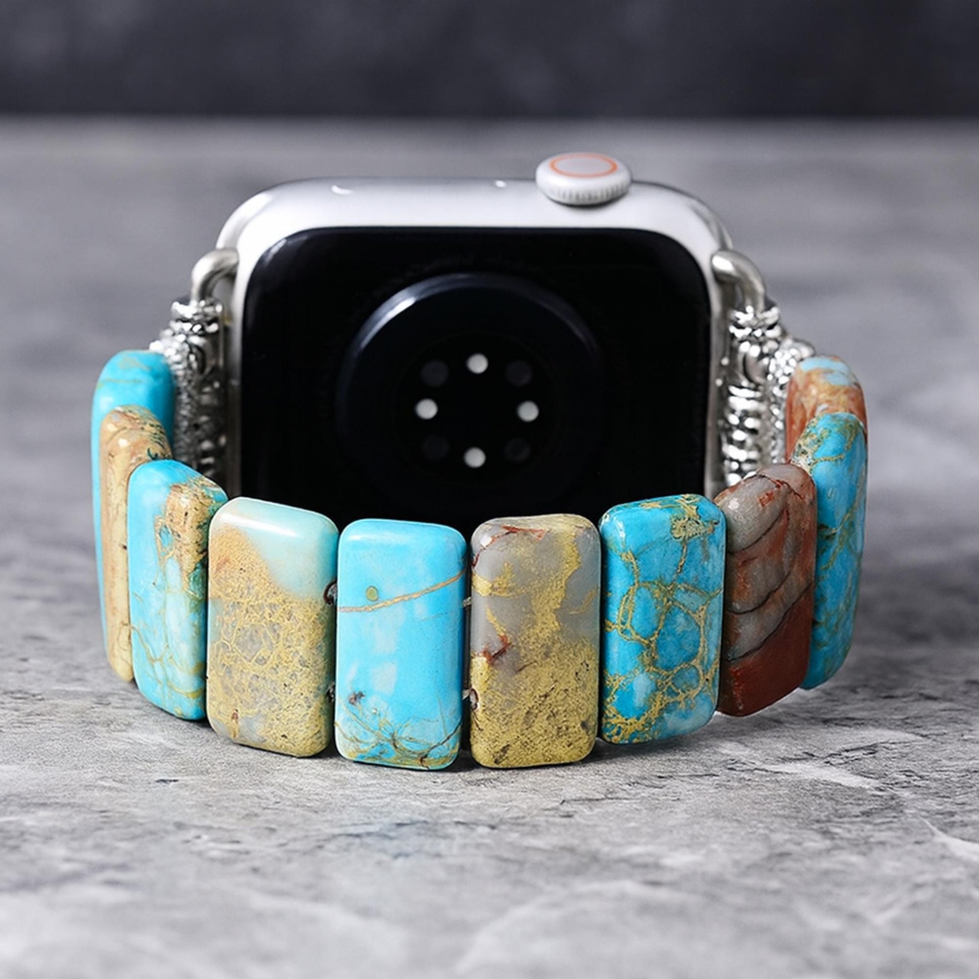 ➳ This bracelet band features genuine turquoise and jasper stones in earthy browns and ocean blues. Its bold rectangular beads and silver-toned accents create a soulful boho style full of natural charm.